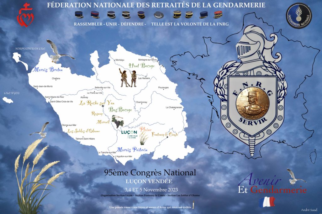 Les 3, 4et 5 novembre, la F.N.R.G. (Fédération Nationale des Retraités de la Gendarmerie) a tenu son congrès dans la jolie ville de Luçon en Vendée. Les travaux ont débuté dès le vendredi avec un conseil d’administration préparatif à l’assemblée générale du lendemain. Le samedi, le président en exercice a souhaité la bienvenue aux congressistes avant que ne soient exposés les différents rapports – moral – d’activité – et financier. Puis, le président de la commission presse a fait un exposé sur la revue de l’association « Avenir et Gendarmerie ». Après les élections des nouveaux administrateurs et des sortants qui se représentaient et la remise des récompenses, une cérémonie avec dépôt de gerbe a eu lieu devant une plaque hommage au colonel Arnaud Beltrame. Étaient présents à cette cérémonies, les autorités politiques et administratives de Vendée, dont le maire de Luçon, et bien entendu les représentants de l’active. Le président de l’U.N.P.R.G. nous a fait l’honneur de sa présence. Après la pause pour le repas, le nouveau conseil d’administration s’est réuni pour élire un bureau national. André SAAD a été élu président national – Jean-Claude FONTAINE, président adjoint – Christian BOURNONVILLE, vice-président national – Françoise MORCRETTE, secrétaire générale – René VANBATTEN, trésorier général – Christian BLANQUERT, secrétaire adjoint et Claude BALARD, trésorier adjoint. Ce congrès s’est déroulé dans une excellente ambiance que ce soit durant l’exposé des différents rapports ou pendant les élections.